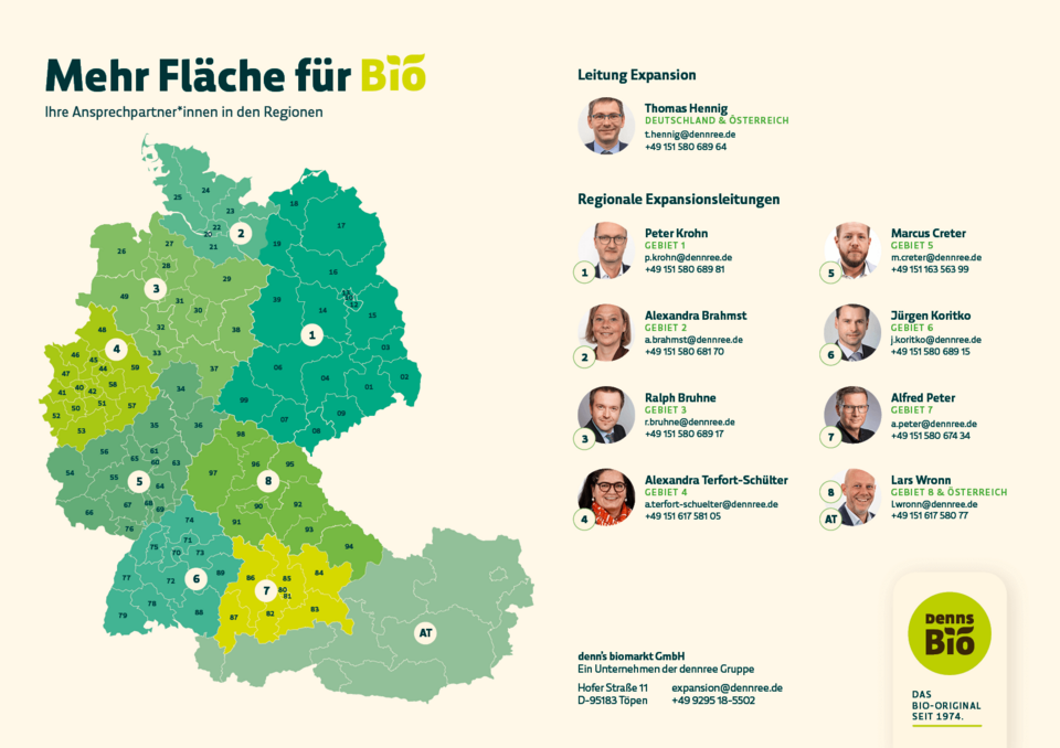 Nah an unserer Kundschaft, kompetent und zuverlässig sind wir als Bio-Fachexperte der richtige Partner für dich und deinen Standort. Von frischem Obst und Gemüse bis hin zur Naturkosmetik geben wir Bio ein Zuhause. Für den konsequenten Ausbau unseres Netzes an Denns BioMärkten und dem BioMarkt Verbund suchen wir geeignete Flächen in Deutschland und Österreich.